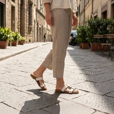 A puha, bőr bevonatú lábágy anatómiai kialakítása garantálja a kényelmet a hosszú nyári napokon, legyen szó városi sétáról vagy tengerparti pihenésről.