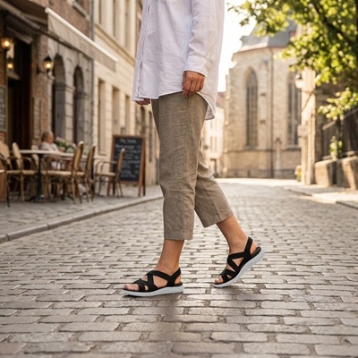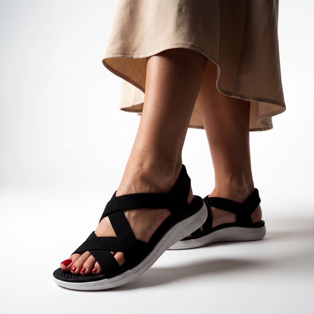 A könnyen felvehető kialakításnak köszönhetően egyszerűen csak belelépsz – nem kell lehajolni, nem kell kézzel igazítani. A rugalmas, gumis felsőrész finoman alkalmazkodik a lábfejhez, így stabil tartást ad anélkül, hogy szorítana.